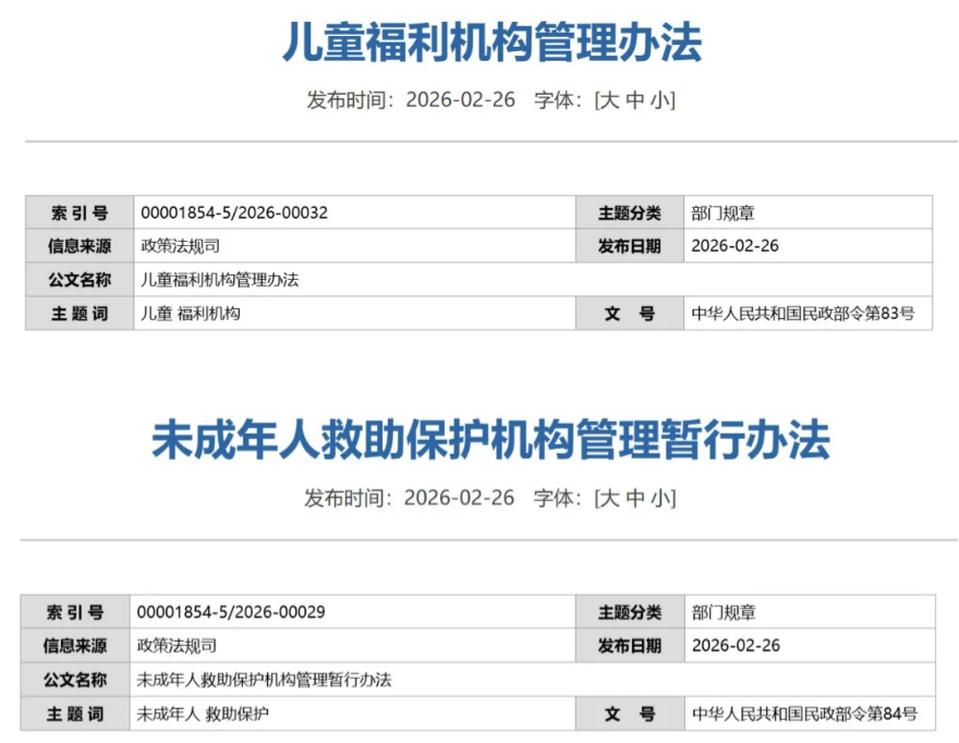 近日,民政部公布新修訂的《兒(er) 童福利機構管理辦法》和《未成年人救助保護機構管理暫行辦法》。兩(liang) 個(ge) 辦法均自2026年4月1日起施行,並在內(nei) 部管理章節明確機構安全管理主體(ti) 責任,提出完善消防安全、應急管理等方麵的具體(ti) 措施和監管要求。